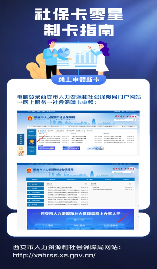 以上的方法不仅可以自己申领社保卡,还可以用来帮助身边不会使用智能手机的老年朋友进行办理。手边有电脑的,也可以登录西安市人力资源和社会保障门户局网站进行查询和预约,如果查询到您未制卡,您可按照系统提示进行制卡信息提交,或点击“社会保障卡申领”进行制卡信息提交。