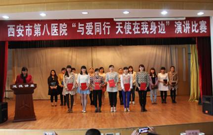 为增强我院护理团队凝聚力,稳定医院护理队伍,展示默默奉献在临床第一线的白衣天使美好形象,提高护理人员的综合素质,2015年3月31日下午,西安市第八医院组织举办了“与爱同行天使在我身边”主题演讲比赛,院领导及临床、医技等科室106人参加会议。来自临床科室19名选手,分别结合各自的岗位与临床工作实际,从不同角度阐述了她们对护理事业特别是对传染病护理工作的理解和认识。动情而精彩的演讲,充分展示了我院护理人员饱满的工作热情和爱岗敬业、无私奉献的良好职业风貌,经过评委们认真打分,共评出一等奖一名、二等奖两名、三等奖三名,肝病六科李娟荣获一等奖, 院领导为获奖选手分别颁发了荣誉证书。