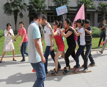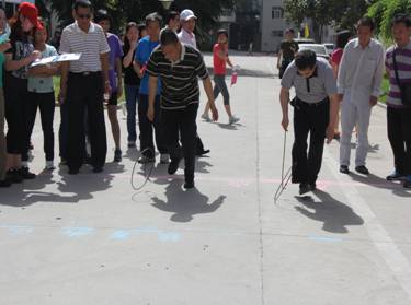 精彩纷呈比赛中,选手们必须完成摇呼啦圈、滚铁环、托乒乓球和摸石头过河四个小项的比赛。滚铁环比赛参赛的几乎都是年纪在四十岁左右的中年人,滚着铁环跑的情景让许多人回忆起了小时候。比赛过程中,院领导也被大家欢快的气氛所感染,院长张新昀和后勤院长郭宗虎进行了一场“滚铁环大赛”,参赛选手们还将自己比赛经验“倾囊相授”。齐心协力是让5位参赛选手依次穿着2米左右的“木板鞋”,用一样的步伐向前走,比赛中,六分会的参赛选手因为步调不一致,导致选手们“坐”在了“鞋上”,惹得场下一阵笑声。车轮滚滚比赛要求选手们站成一排,踩着一个布制的圆环,手脚并用在赛道内向前行,五分会的参赛队伍在第一名选手的带领下,集体跑到了对手的赛道上,引得大家又一阵笑声。