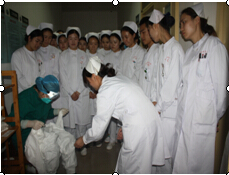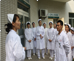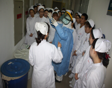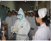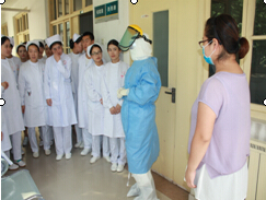 演练场景设置为医院新接诊一例需三级防护的传染病患者为例,模拟从预检分诊直到患者入院的全过程。门诊就诊环节的演示,重点放在了护理人员穿隔离衣、防护服、护目镜等三级防护上,带教老师不仅亲自演示了三级防护隔离衣、防护服等的穿脱程序,还穿着厚重的防护服按照工作程序接诊患者、安排入院。