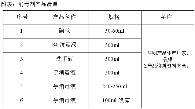 二.项目内容:我院碘伏、84消毒液、洗手液和手消毒液4种消毒用品集中采购,确定供应商及供货价格,品种规格要求见附表;供货期限一年。