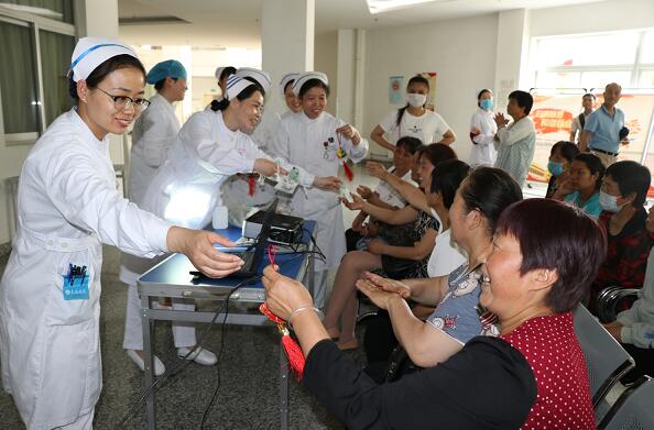 讲座首先由肝病二科护士长贾莉霞、肝病一科护士长朱建英从肝病的饮食、休息及锻炼等方面进行讲解,两位护士长图文并茂、深入浅出的给大家讲解了如何养肝、护肝。随后,特管病区护士长杨梦菲为大家讲解并示范了七步洗手法的标准步骤,患者及家属纷纷伸出双手跟着护士一起学习规范的洗手动作。讲座结束后,护理部还为患者们免费发放了医院自制的保肝、防蚊虫药囊及香囊,并送去了端午节的节日祝福。