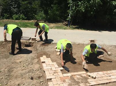 到老人家,张艳副院长先问候了解老人身体和生活近况,与老人沟通了我们的来意后,志愿者们分头开展工作,查体、义诊、修路、铺砖,党员志愿者们有的挥舞铁锨平路、有的运送水泥、有的搬砖铺路。大家头顶烈日、身处“蒸笼”,却依然干的热火朝天,用辛勤的汗水换来修路的有序进展。通过一上午努力,原本坑洼不平,一下雨就积水湿滑的院子,变得平整有序,美观舒适。
