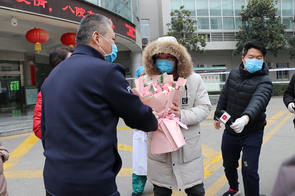 下午15时,在隔离一区主任李燕平和护士长申莹的陪同下,患者来到了西安市第八医院门诊楼前,西安市第八医院院长郭雅玲、副院长郭宗虎、张艳和许优向患者表示了祝贺。许优副院长介绍了患者的基本情况,郭宗虎副院长为患者送上了鲜花。
