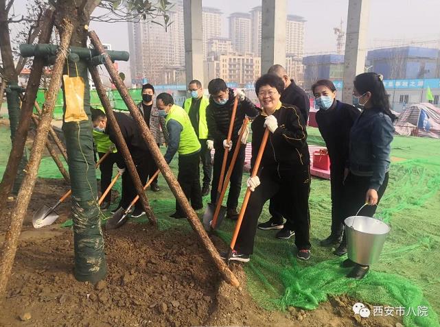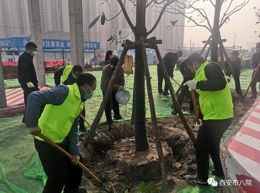 早春三月,鲜花吐蕊,春意盎然,一年一度的植树节之际,西安市第八医院领导班子来到了红会医院高铁新城院区在建现场,同市卫健系统各单位共同参加了由西安市卫生健康委员会主办的西安市卫生健康系统2021年全民义务植树节活动。早上9时植树活动开始,院领导们为一株株玉兰树苗培土、浇水,并为它们挂上了写有书名、栽种日期的小名片。