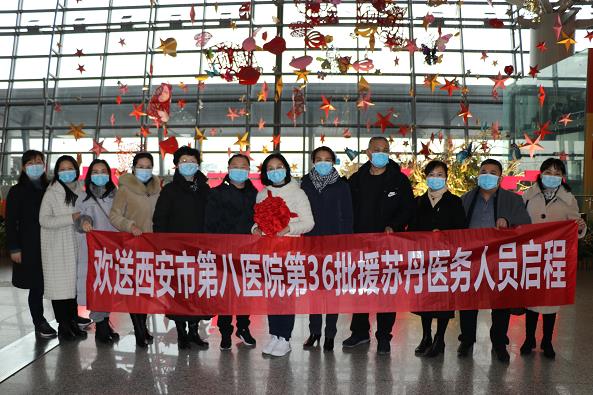 2021年1月15日上午9 时,西安市第八医院院长郭雅玲,副院长郭宗虎、张艳带领科教科、护理部、医务科、院办、人事科等科室负责人驱车来到西安咸阳国际机场,为市第八医院参加第36批援苏丹医疗队医务人员送行。