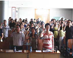 讲堂共设六个环节:省心、重温誓词、唱响八院院歌、看一部短片、诵道德经典、做道德承诺。省心环节,全体参会人员在主持人的引导下,闭目自省,使大家平日躁动的内心得以平复。为了让医务人员们牢记自己的使命,再次感受从医时的初衷,大家共同重温了中国医生誓言及希波克拉底誓言。庄严的誓言,熟悉的场景,让白衣天使们再次感受到了医务工作的神圣和崇高。