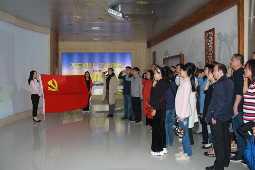 在鲜红的党旗前,全体党员庄严地举起右拳重温了入党誓词。